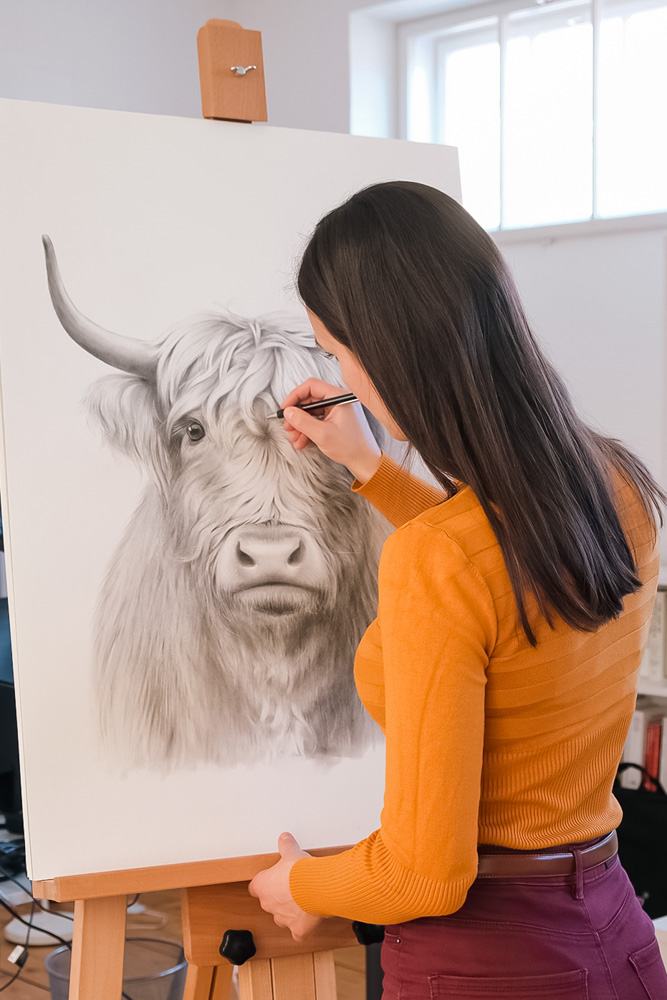 I chose a larger format for the cow drawing in order to be able to show more details. Here I mainly worked with pencil and black pastel powder. In order to draw realistic drawings of animals, it is always important to have good reference images. For this work I merged 4 pictures into one drawing. Some elements (e. g. light situation) of an already existing cow drawing have also been merged into this work.