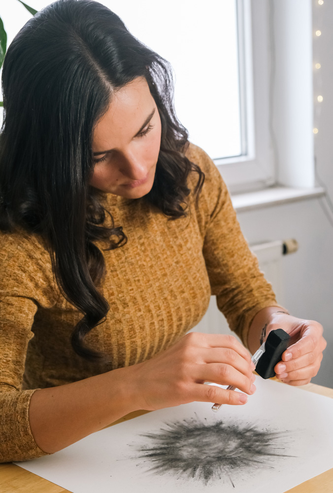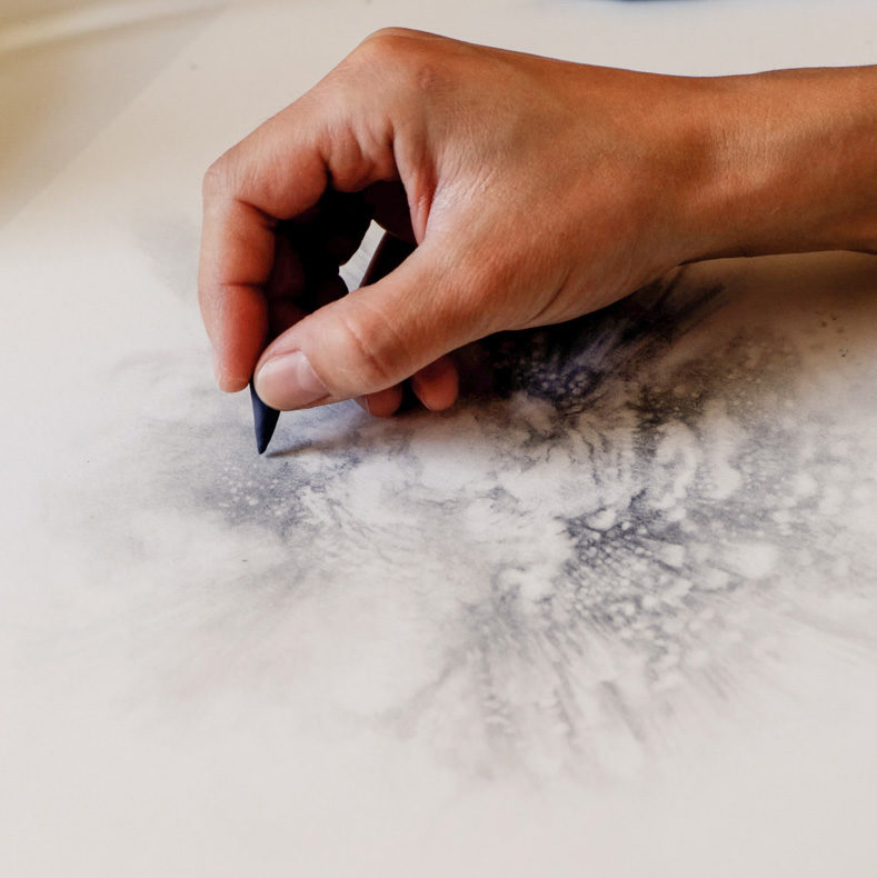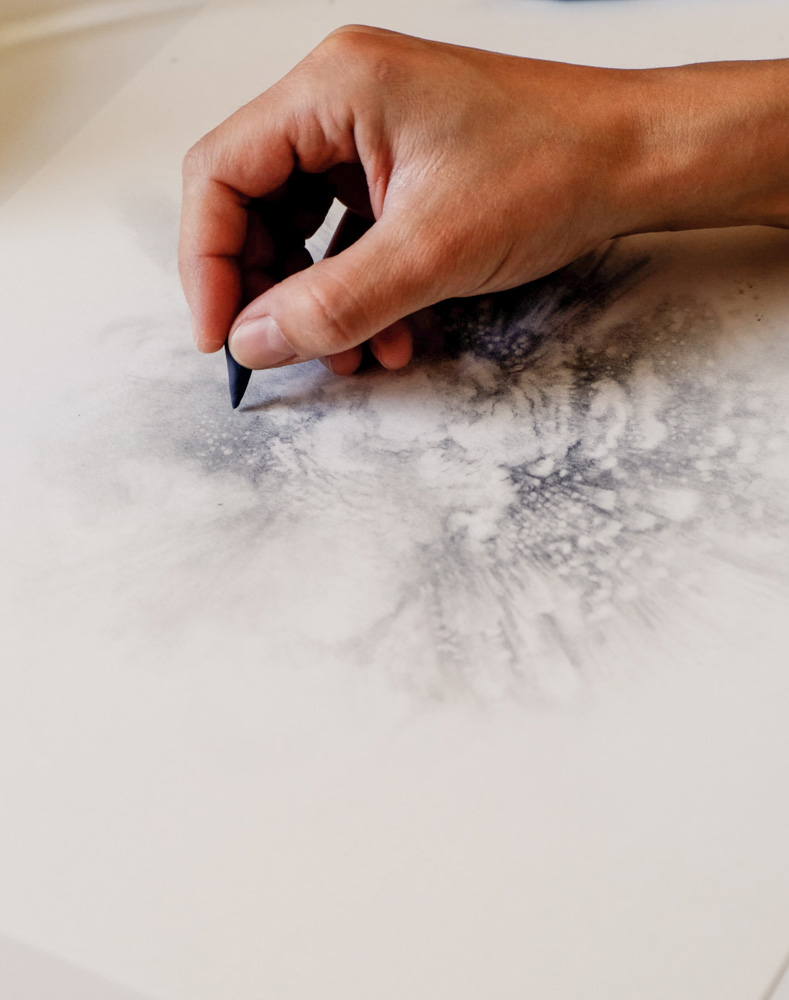 I used a variety of techniques for the collagen (protein powder) illustration, which is intended to depict a powder explosion. In addition to the conventional pencil, graphite powder, blending stumps, cotton swabs, handkerchiefs, kneaded erasers, charcoal and a scalpel were also used for this complex illustration. I really enjoyed this experimental work with a wide variety of materials and techniques!