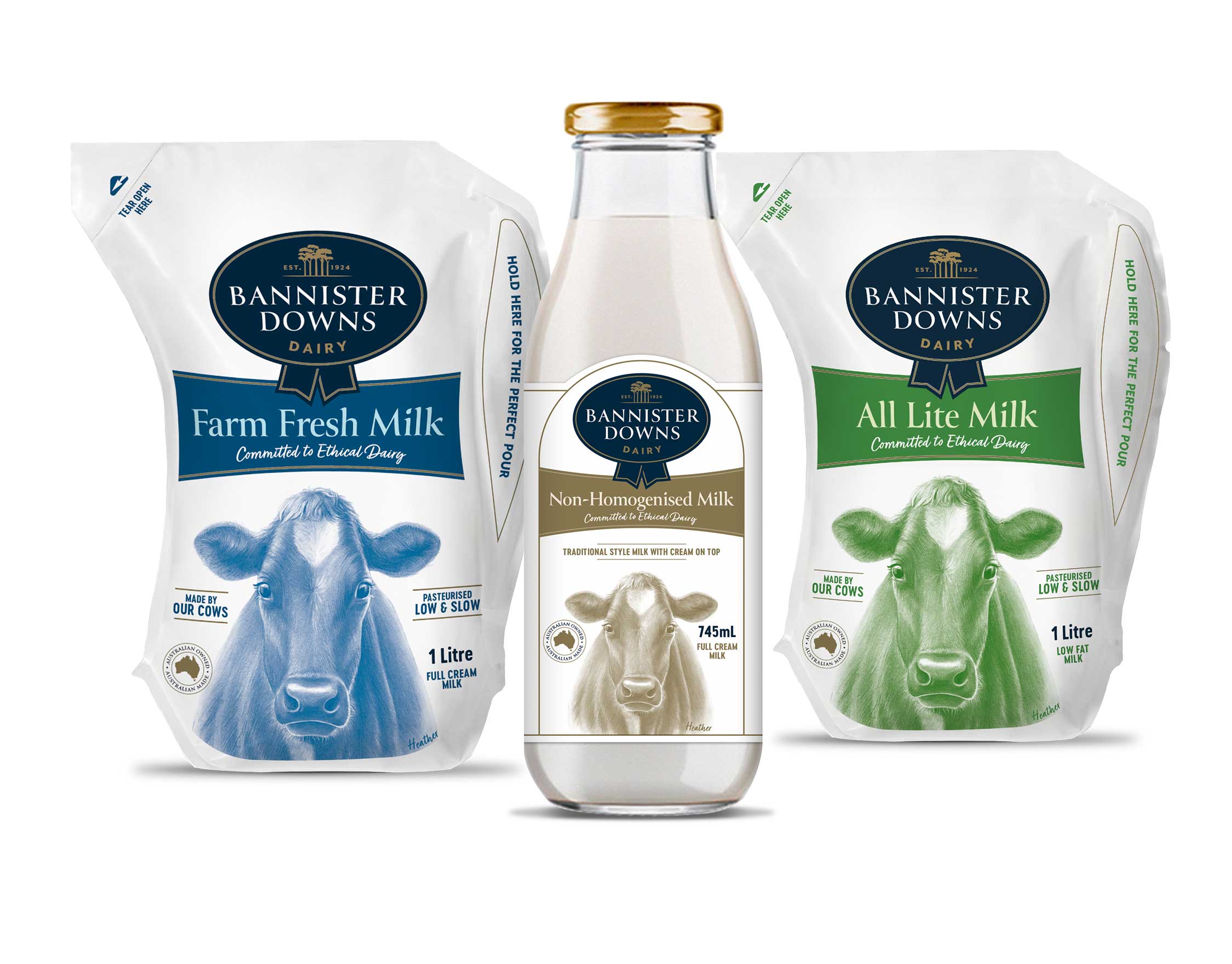 Das australische Milchunternehmen Bannister Downs erhielt ein auffälliges Verpackungs-Rebranding durch neue handgezeichnete Bleistiftportraits von zwei besonderen Kühen, die tatsächlich dort auf dem Hof leben. Die frontalen Portraits schauen den Betrachter direkt an und verleihen der Verpackung eine persönliche Note. Bannister Downs legt besonderen Wert auf das Wohlbefinden seiner „Girls“ und ist ein in vierter Generation geführtes Familienunternehmen.