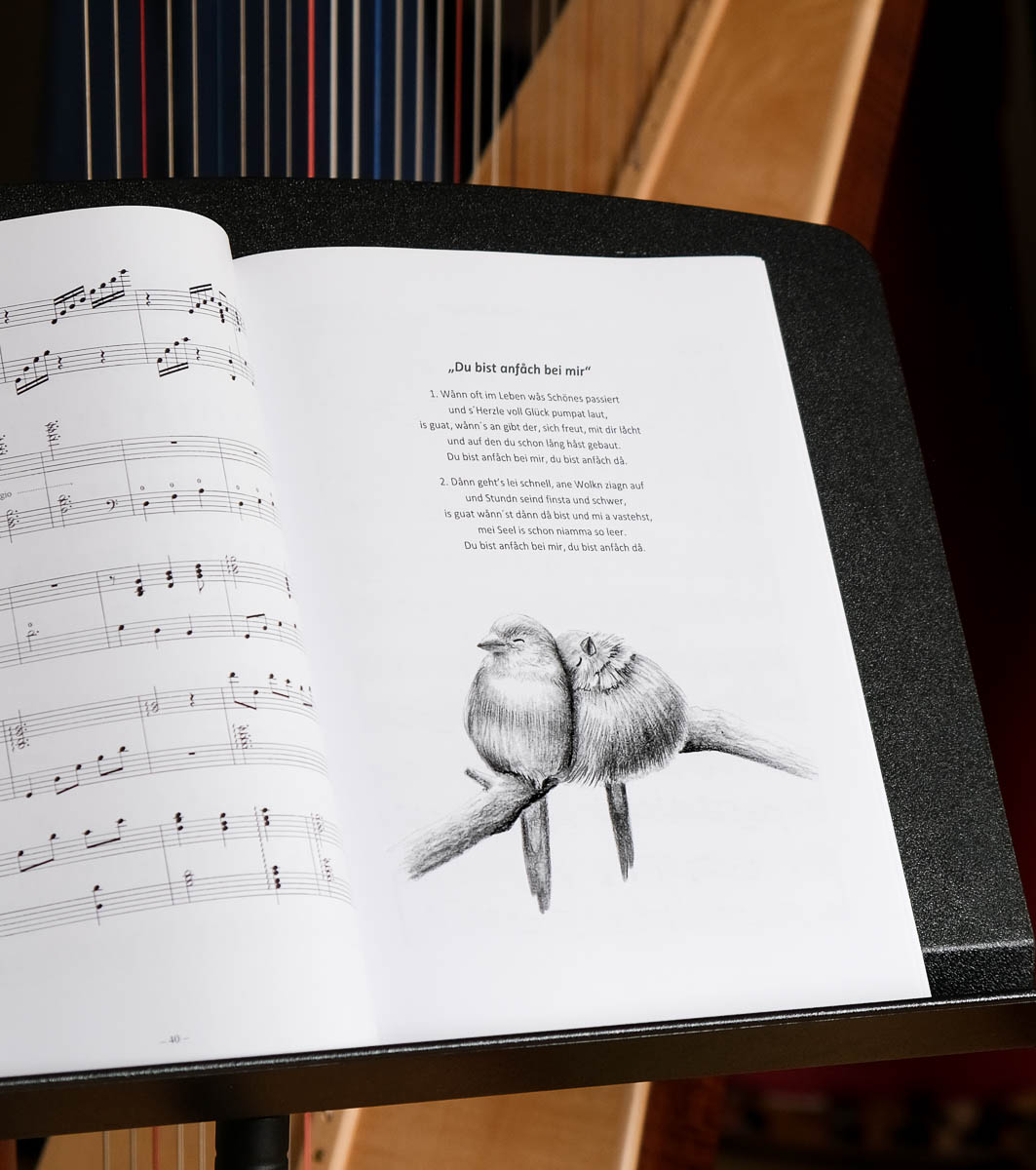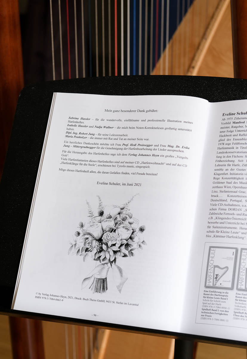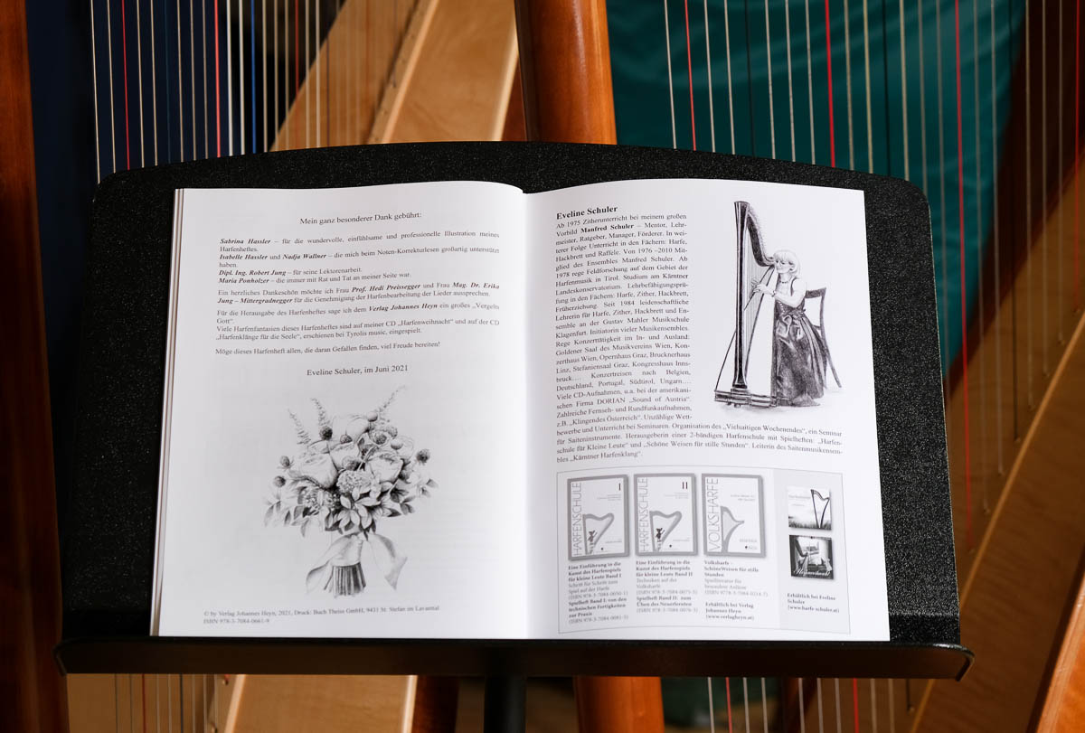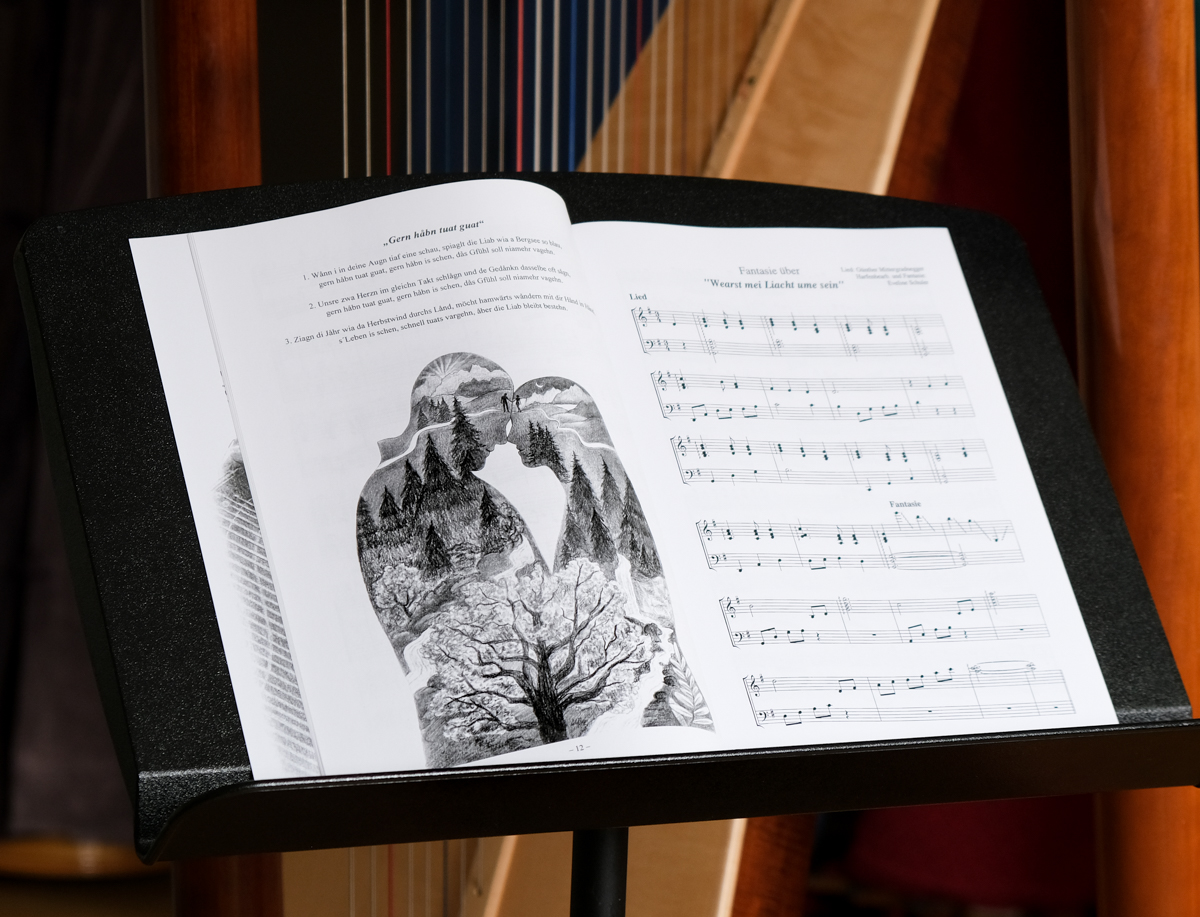 Die Solo-Harfenistin Eveline Schuler hat in diesem Notenheft alle ihre über die Jahre hinweg komponierten Fantasien über bekannte Kärntner Lieder gebündelt. Entstanden ist ein ein Liederbuch für die Harfe, auf das viele schon lange gewartet haben. Passend zu den Liedern (beispielsweise „Gern habn tuat guat“ oder „Schean still fallt dar Schnea“) sind schwarz-weiße Illustrationen entstanden, die den verträumten Charakter der Lieder gut visualisieren.