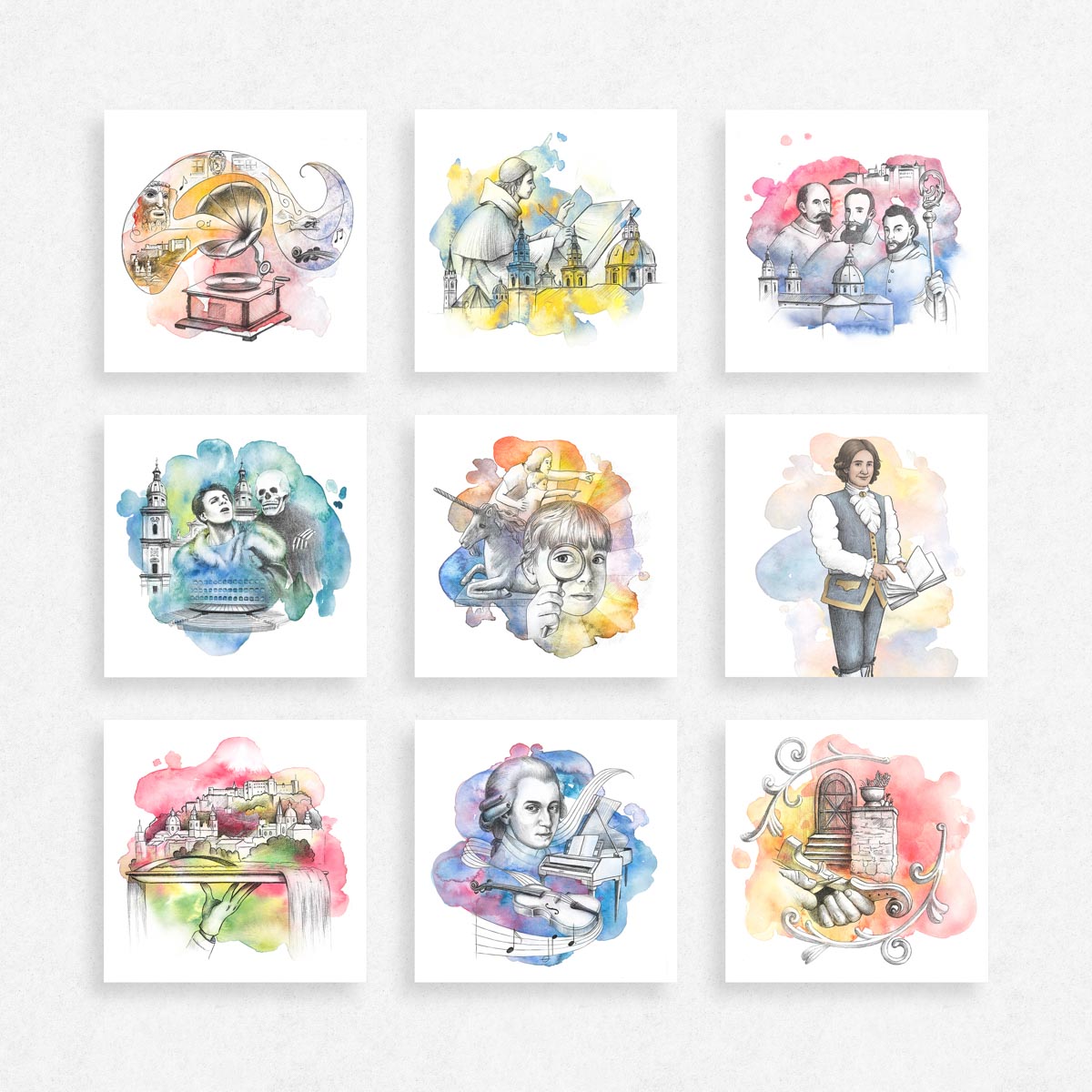Illustration von Stadtführungs-Themen für Salzburg Leporello Stadtführungen, Marlene Kohlschütter-Schmidt