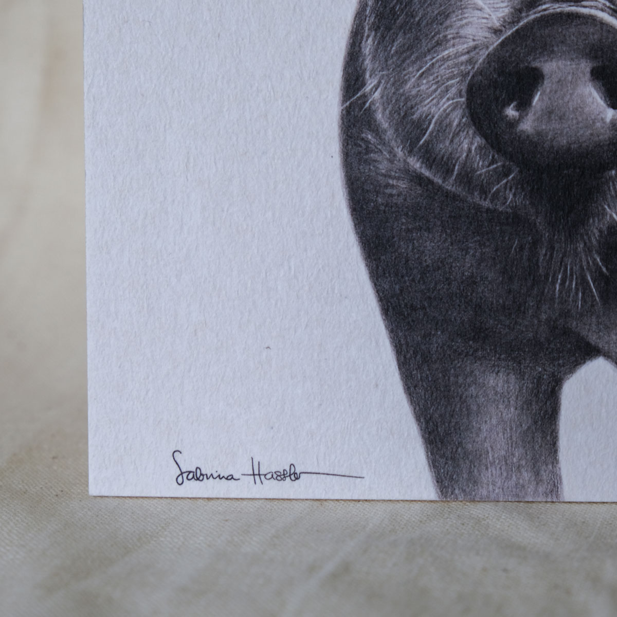 Dieses Tierportrait habe ich speziell auf die Wünsche des Auftraggebers angepasst. Die Rasse „Duroc“ hat im Gegensatz zum Hausschwein ein dichteres rotbraunes Fell – was die Umsetzung für mich umso spannender gemacht hat. Das Zeichnen von realistischen Borsten und Fell war eine besondere Herausforderung, die mir viel Spaß bereitet hat!